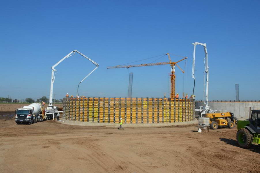 Entre un incesante movimiento de maquinaria y recursos humanos, afectados a tareas de hormigonado, la visita a la obra mostró un segundo digestor (post-fermentador) de cuatro metros de altura en plena ejecución, el que tendrá una capacidad de 110 m3. La próxima etapa será la construcción de plateas y de los caminos internos que conectarán con ruta 8.