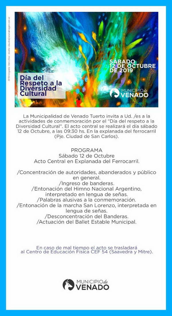 Este sábado 12 de octubre, a partir de las 9.30, se realizará en la explanada del ferrocarril (Pasaje Ciudad de San Carlos, Sarmiento y Juan B. Justo) el acto oficial del Día del Respeto a la Diversidad Cultural.