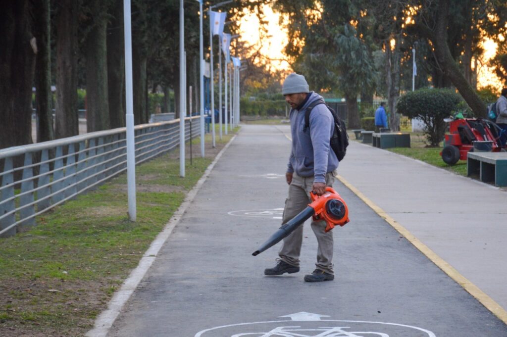 En el Parque Municipal General Belgrano se realiza la limpieza y desinfección de baños y vestuarios; trabajos de pintura en bancos; demarcación de pista de atletismo y barrido general del predio.