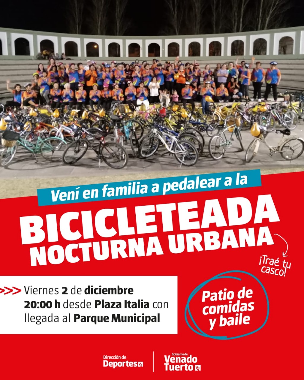 Este viernes, organizado por el Gobierno de Venado Tuerto a través de la Dirección de Deportes, se desarrollará una “Bicicleteada Nocturna Urbana” de participación libre y gratuita.