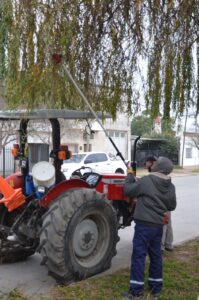 Los equipos de la Dirección de Espacios Públicos del Gobierno municipal realizan poda con hidroelevadores en Chaco al 700 y en Sociedad Rural, y corte de raíz y extracción en calle Buenos Aires, entre Pringles y Arenales.