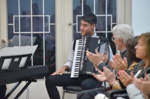 El encuentro contó con una amenización musical del acordeonista Valentino Giraudo (alumno del CAR) y del pianista Gabriel Mojica (miembro de Interact), quienes fueron destacados por la socia rotaria Elena Río y recibieron sendos reconocimientos. También hubo un intercambio de presentes entre el profesor Pérez y la directora del CAR, Mariela Anello.