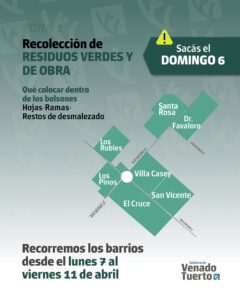 El Gobierno de Venado Tuerto, a través de la Secretaría de Servicios y Obras Públicas, informa el esquema de recolección de residuos verdes y de obra que se implementará del lunes 7 al viernes 11 de abril.