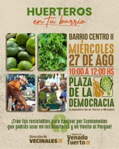 Además, como cada miércoles, estará habilitado un ecopunto para el canje de residuos reciclables (limpios y secos), por ecomonedas para adquirir mercadería en los “Huerteros en tu Barrio” y en la feria dominical “Venite al Parque”.