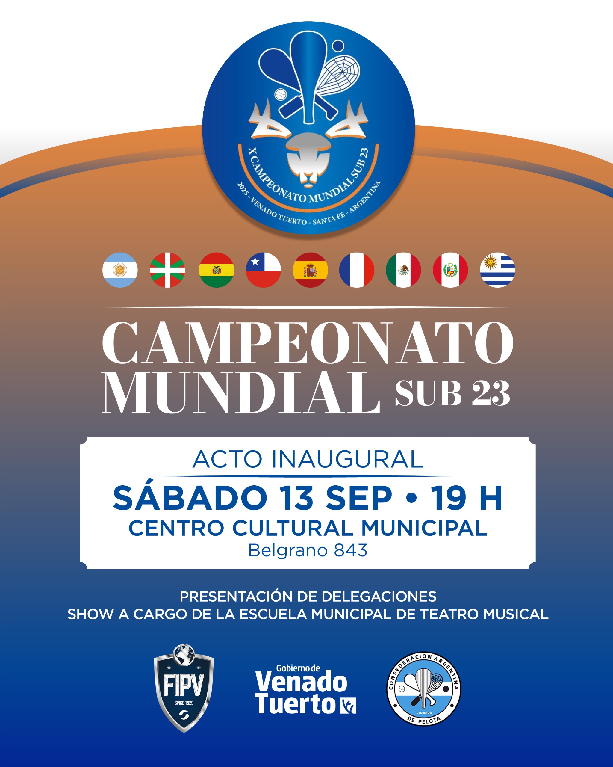 El Gobierno de Venado Tuerto y la Confederación Argentina de Pelota (CAP) invitan al acto inaugural del X Campeonato Mundial Sub 23 de Pelota Vasca, el sábado 13 de septiembre a las 19 en el Centro Cultural Municipal.