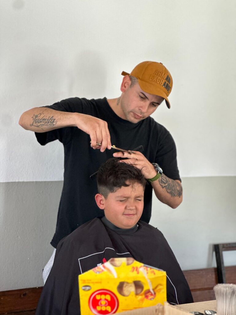 En esta jornada de “Tijeras Solidarias”, brindaron sus servicios los peluqueros Thiago, Brian Navarro, Uriel Morales y Eder Garay.