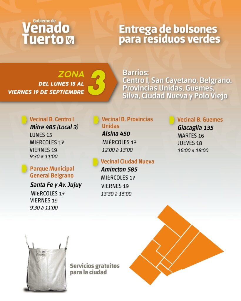 El Gobierno de Venado Tuerto, a través de la Secretaría de Servicios y Obras Públicas, informa el esquema de recolección de residuos verdes que se implementará desde el lunes 22 al viernes 26 de septiembre.