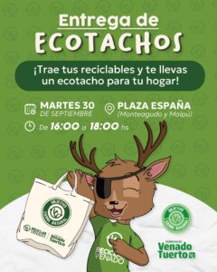 Este martes 30 de septiembre los voluntarios del programa “Reciclar Venado” estarán en la plaza España (Monteagudo y Maipú), de 16 a 18, para recibir residuos reciclables que acerquen los vecinos y canjearlos por “ecotachos” para el hogar.