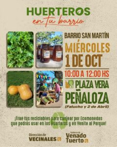 Este miércoles 1 de octubre, de 10 a 12, los “Huerteros en tu Barrio” llevarán toda su producción fresca a la plaza “Rosario Vera Peñaloza” (Falucho y 2 de Abril) de barrio San Martín