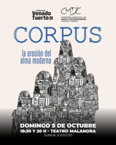 La Compañía Municipal de Danza Contemporánea Venado Tuerto (CMDC) se presentará oficialmente con la obra “Corpus: la erosión del alma moderna”, el domingo 5 de octubre en doble función, a las 18.30 y 20, en Teatro Malandra (JB Justo 157).