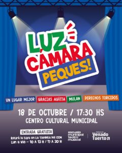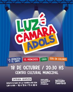 La doble propuesta será el sábado 18 de octubre en el Centro Cultural Municipal, a las 17.30 con “Luz, Cámara, Peques!” y las obras Un Lugar Mejor, Gracias Agüita, Mulan y Derechos Torcidos; y a las 20.30 con “Luz, Cámara, Adols!”, con fragmentos de La Princesa y el Sapo, El Principito, Coco y Titu en Colores.
