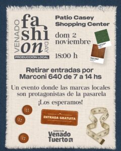 Marcas de nuestra ciudad en todo su esplendor presentarán sus colecciones y tendencias, con el apoyo del Gobierno de Venado Tuerto. Participarán: El DYC, Joplin, Moea, Entrevero, Toukan Footwear Zapas, Cruzgaucha, Carlina Novak, Laura Felici, De Yu, Miss Abaca, Bi Abanicos, Camila Esnoz, Valentina Damen y Moira Moli.