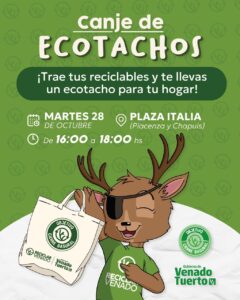 Hoy, 28 de octubre los voluntarios del programa “Reciclar Venado” estarán en la plaza Italia (Piacenza y Dr. Luis Chapuis), de 16 a 18, para recibir residuos reciclables que acerquen los vecinos y canjearlos por “ecotachos”.