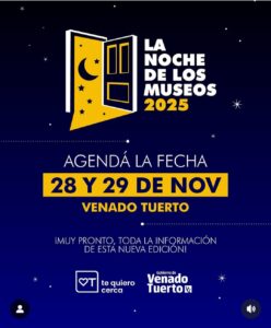 El Gobierno de Venado Tuerto, con la coordinación de la Secretaría de Territorialidad y Desarrollo Cultural, avanza en la organización de “La Noche de los Museos 2025”, que se desarrollará el viernes 28 y sábado 29 de noviembre.