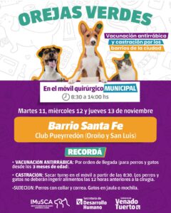 La Secretaría de Desarrollo Humano informa que el Instituto Municipal de Salud y Convivencia Animal (Imusca) estará con el programa gratuito “Orejas Verdes” en el barrio Santa Fe.