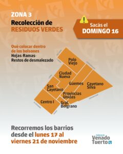 El Gobierno de Venado Tuerto, a través de la Secretaría de Servicios y Obras Públicas, informa el esquema de recolección de residuos verdes que se implementará desde el lunes 17 al viernes al 21 de noviembre.