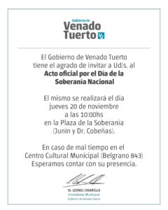 El Gobierno de Venado Tuerto conmemorará el Día de la Soberanía Nacional con un acto oficial que se efectuará el jueves 20 de noviembre a las 10 en la plaza Soberanía Nacional, Junín y Dr. Cobeñas, barrio Villa Casey.