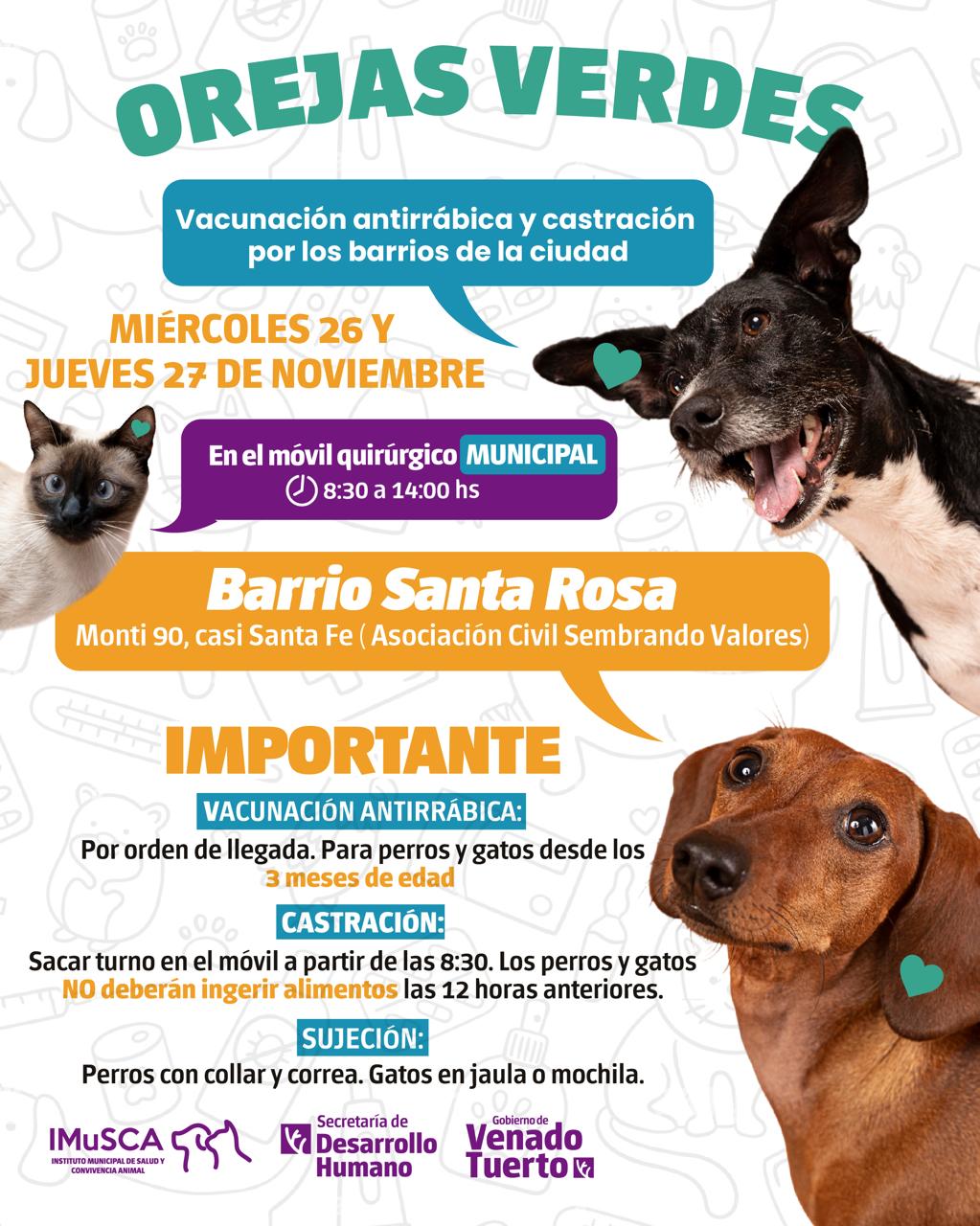La Secretaría de Desarrollo Humano informa que el programa de salud animal “Orejas Verdes”, dependiente del Imusca, prestará sus servicios gratuitos de castración y vacunación antirrábica a los vecinos del barrio Santa Rosa.