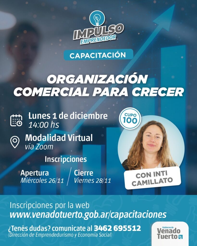 El lunes 1 de diciembre, a las 14, se realizará a través del programa Impulso Emprendedor, de la Secretaría de Desarrollo Productivo, la capacitación “Organización comercial para crecer”, en una sola clase virtual (vía zoom) que será dictada por Inti Camillato.