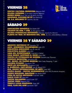 Cada espacio definió su modo de participación, sea en recorridos guiados, exposiciones artísticas, espectáculos en vivo, talleres interactivos, propuestas lúdicas para infancias y otros. Algunos espacios participarán solo un día y en su mayoría lo harán ambas jornadas (ver flyer adjunto).