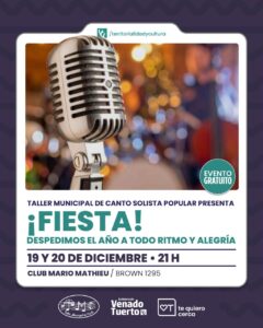 El Taller Municipal de Canto Solista Popular despide el 2025 con una doble presentación en Club Ciclista Mario Mathieu, Brown 1295, con la organización de la Secretaría de Territorialidad y Desarrollo Cultural.