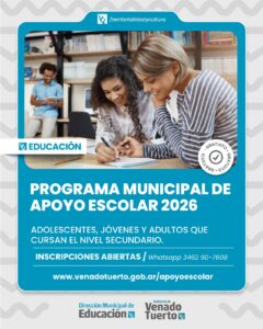 El Gobierno de Venado Tuerto, a través de la Secretaría de Territorialidad y Desarrollo Cultural y la Dirección de Educación, tiene abierta la inscripción para el Programa Municipal de Apoyo Escolar del corriente año.