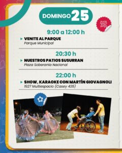 Una nueva edición de “Nuestros Patios Susurran”, se realizará este domingo con una grilla íntegramente folklórica, con las presentaciones de Sin Orilla, Folclore Vivo, Ballet Renacer y Omar Olmedo. La propuesta de la Secretaría de Territorialidad y Desarrollo Cultural tendrá lugar en la plaza Soberanía Nacional (Junín y Dr. Cobeñas) a partir de las 20.30.