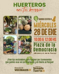 Además, como cada miércoles, estará habilitado un ecopunto para el canje de residuos reciclables (limpios y secos), por ecomonedas para adquirir mercadería en los “Huerteros en tu Barrio” y en el “Venite al Parque” dominical.