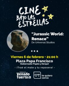 La propuesta cultural del Gobierno de Venado Tuerto, “Cine Bajo las Estrellas” ofrecerá este viernes 6 de febrero una nueva película para toda la familia: “Jurassic World Renace”.