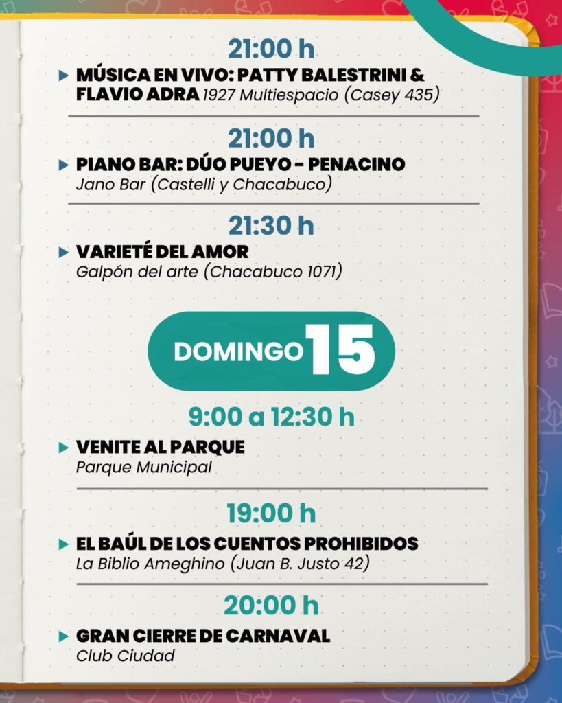 La agenda local para este fin de semana, caracterizado por el feriado de Carnaval, comienza este viernes con la presentación del libro “Narrativas Mentales” de María Celeste González. El lugar de encuentro será la Biblioteca Florentino Ameghino (Juan B. Justo 42), a las 20.