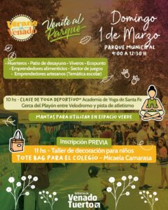 Entre las atracciones que ofrecerá el próximo domingo el paseo de feria “Venite al Parque”, se destacan una clase de yoga deportivo y un taller de decoración para niños, en vísperas del inicio del ciclo escolar 2026.