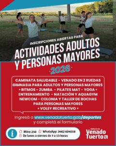 Entre las opciones disponibles se encuentran: Caminatas saludables, Gimnasia para adultos, Pilates Mat y Yoga, Clases de Ritmos, Zumba, Natación y Aquagym; también Newcom (vóley adaptado), Vóley recreativo, Taller de Bochas, el programa «Venado en 2 Ruedas» y la Colonia para Personas Mayores.