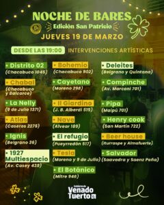 Con la coordinación de la Secretaría de Desarrollo Productivo, este jueves 19 de marzo tendrá lugar otra “Noche de Bares”, en una edición especial para celebrar San Patricio y las raíces irlandesas de Venado Tuerto. La propuesta gastronómica se desarrollará entre las 19 y la medianoche e incluirá a 19 locales gastronómicos de la ciudad.