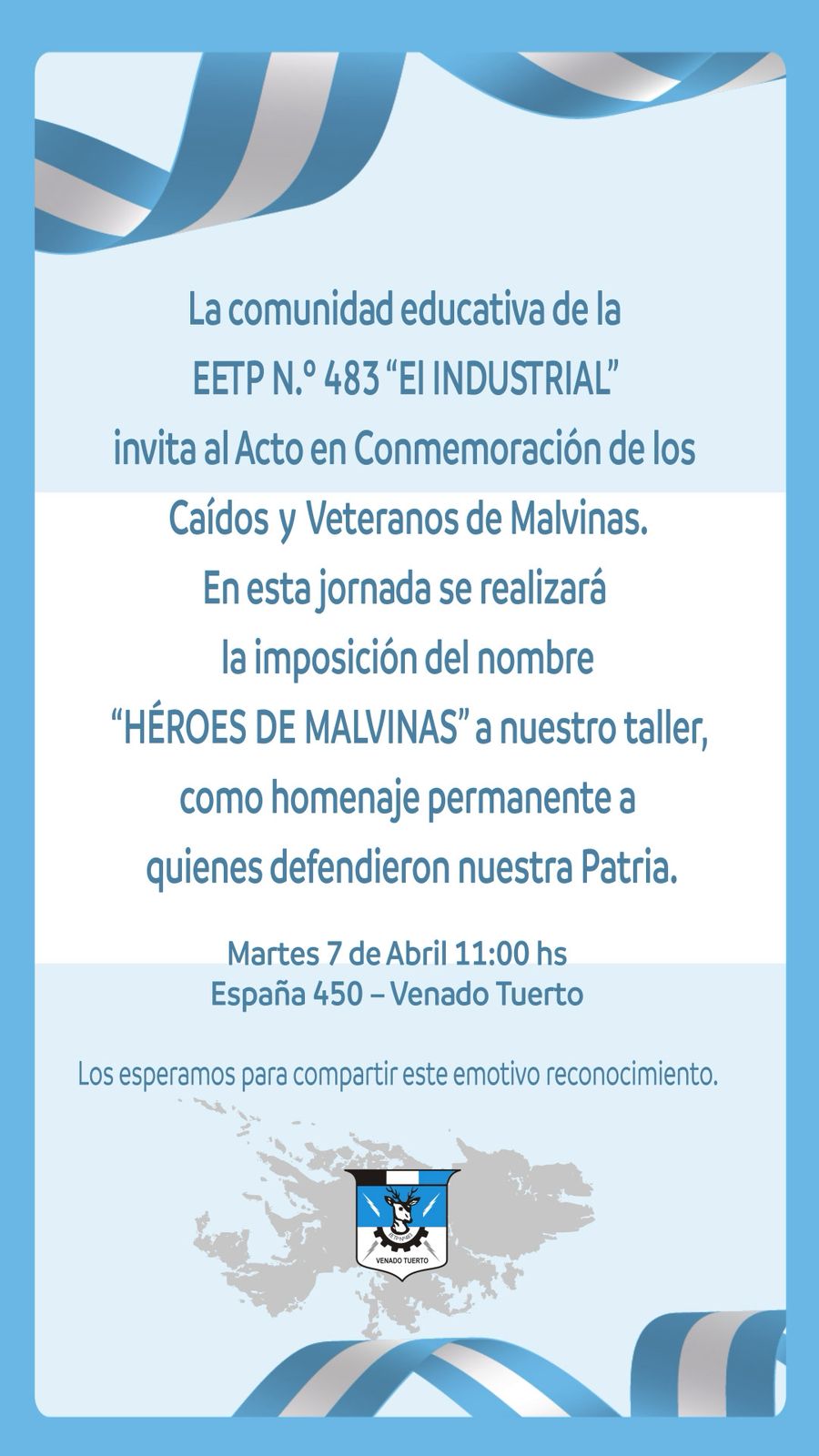 El Gobierno de Venado Tuerto junto con la Dirección de la Escuela de Educación Técnica Nº 483 «El Industrial» invita para el martes 7 de abril a los medios de comunicación a participar del acto oficial en conmemoración del “Día del Veterano y de los Caídos en la Guerra de Malvinas”.